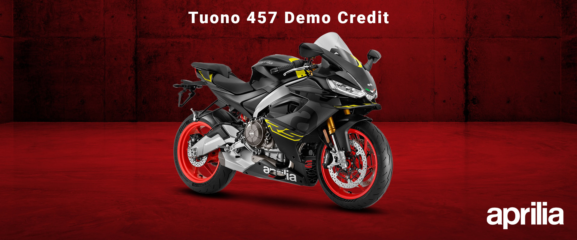 *Offer valid only on the purchase of new and unregistered Aprilia Tuono 457 motorcycles through participating authorized Aprilia dealerships. Customer must complete all eligibility requirements, including demo ride, registration submission within dealership, and warranty registration through dealership, to receive the $500 discount. Discount is applied at the time of purchase through dealership invoice and is not redeemable for cash or transferable. Offer valid 10/01/25 – 10/31/25, and cannot be combined with any other promotions, incentives, or discounts. Aprilia and Piaggio Group reserve the right to modify or cancel this promotion at any time without prior notice. Other restrictions may apply. See your authorized dealer for full details.